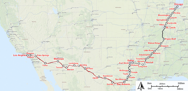 From Alpine to El Paso it was 3 hours non stop [in the south of the map]. At night when the light was shut, you had a very fine view of the stars. Only a truck on the highway, which was as fast as you and drove beside the train. No housing, only the truck, train, stars and you. A blast.